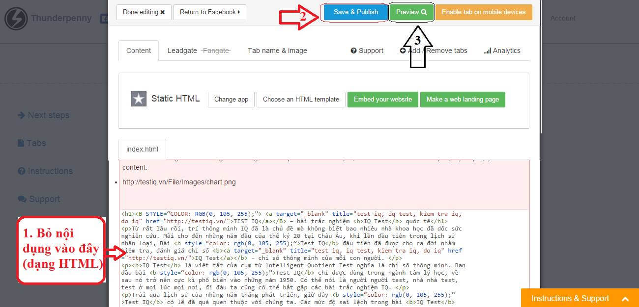 Làm theo hướng dẫn hình minh họa, điền nội dung vào (dưới dạng HTML), bấm save để lưu và preview để xem lại. Vậy là xong rồi đó